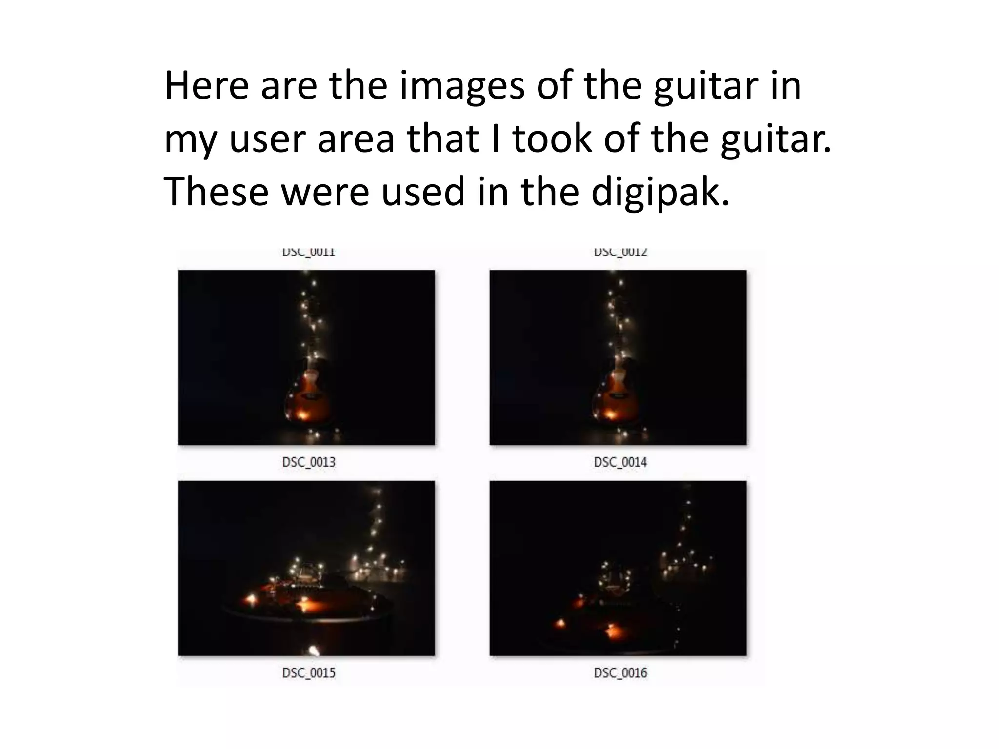 This document provides images from a digipak that was created for a music project. It includes photos of a guitar used as the background for the CD cover and in a music video by the artist. The inside of the digipak also features fairy lights wrapped around the guitar to link the visuals between the packaging and video.