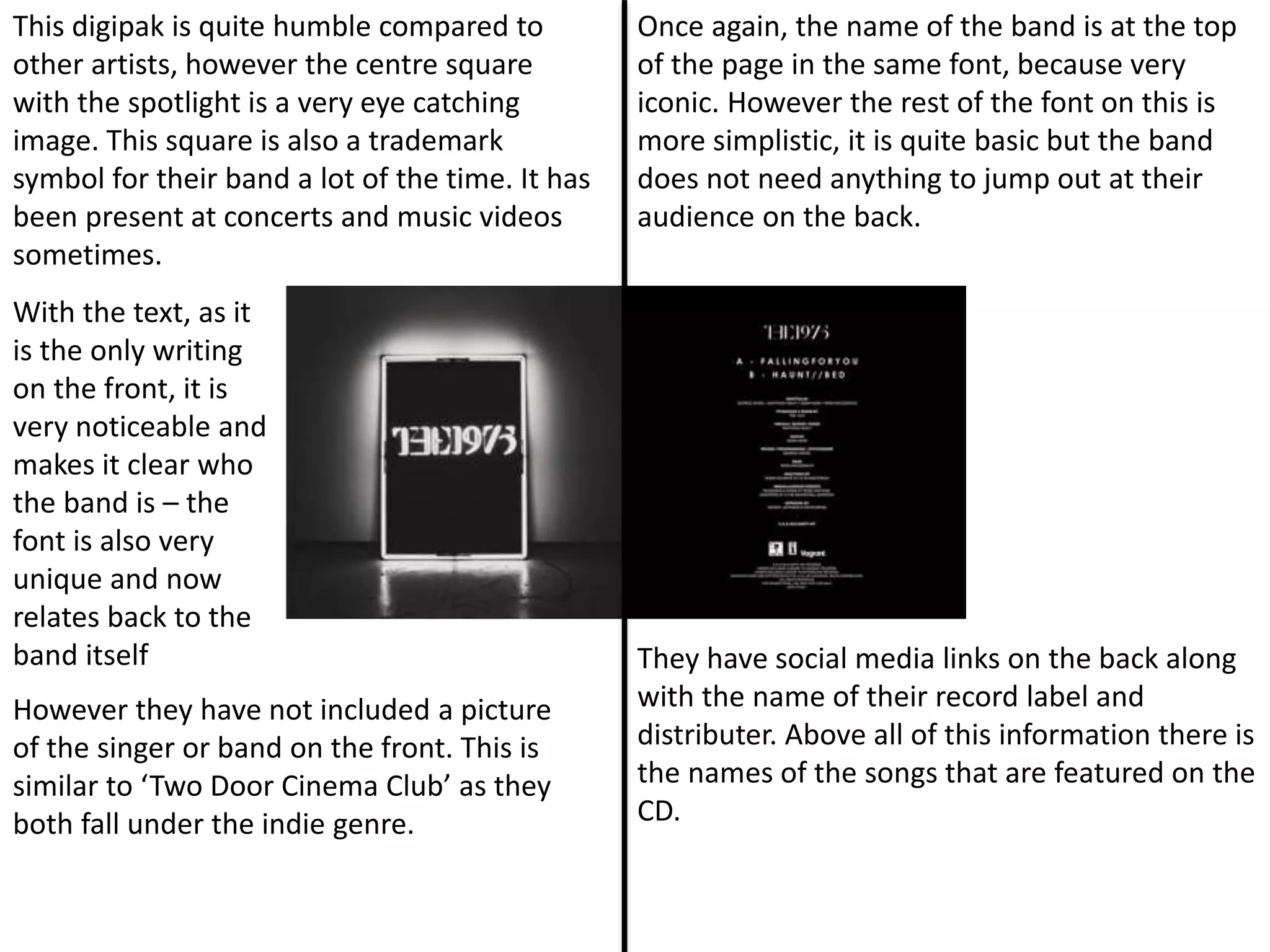 This digipak features an eye-catching central image of a spotlight on a square, which is a trademark symbol for the band. While it does not include photos of the band members, the unique font used for the band name makes it clear who the artist is. Information on the back includes social media links, the record label, and a list of the songs on the CD.