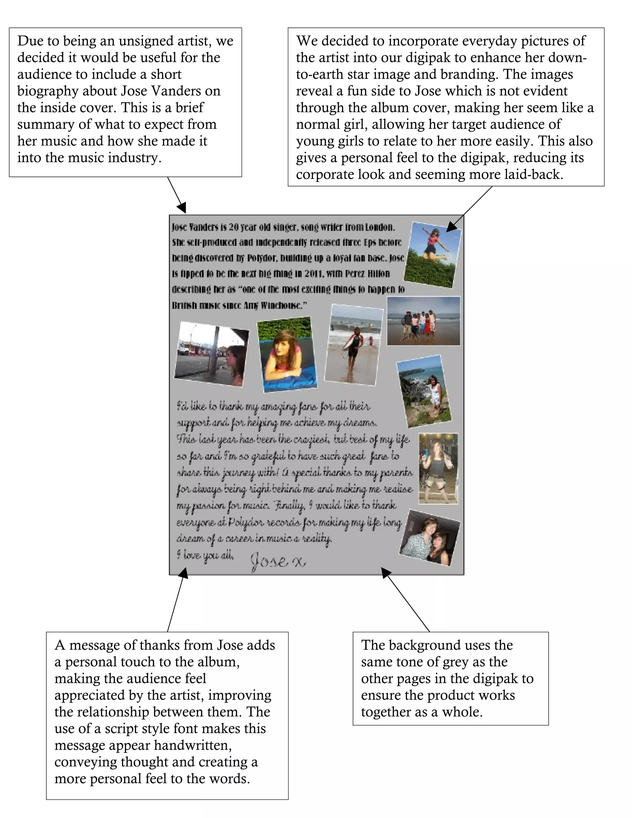 The document discusses including a short biography and everyday pictures of the unsigned artist Jose Vanders in the digipak to present her as down-to-earth and relatable to her target audience of young girls. It also mentions adding a handwritten thank you message from Jose to make the audience feel appreciated and improve their relationship with the artist.