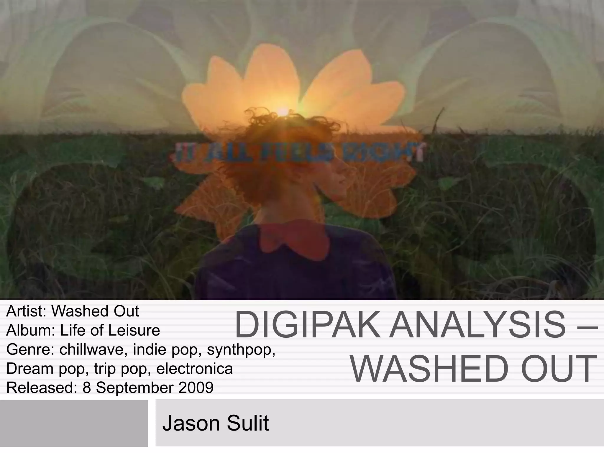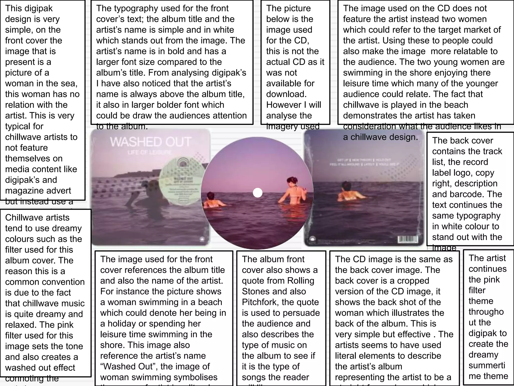The document analyzes the digipak design for Washed Out's 2009 album "Life of Leisure". It summarizes that the front cover features a pink-filtered image of a woman at the beach to represent the chillwave genre and summer theme. The back cover uses the same woman cropped to show her back, relating to the album and artist name. The CD design maintains the washed-out pink filter style with two women at the beach to appeal to both male and female audiences. Overall, the simple but literal design effectively conveys the beach/leisure themes of the artist and music.
