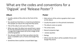 1) Digipaks and release posters for albums follow common conventions - they usually feature the artist's name, album title, tracklist, and image of the artist. Posters also promote where the album can be purchased.