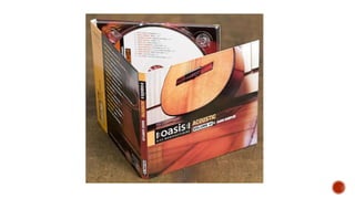 This document analyzes the cover art and packaging design of the album "Oasis Acoustic – Volume VI". The design uses guitar imagery and colors associated with acoustic guitars to clearly communicate that the album contains acoustic versions of songs. Guitar frets are used to frame the band name, a guitar is pictured, and song titles are listed in colors matching an acoustic guitar. The overall minimalist design aims to showcase the laid-back nature of acoustic music through its simplicity and use of white and guitar-associated hues.
