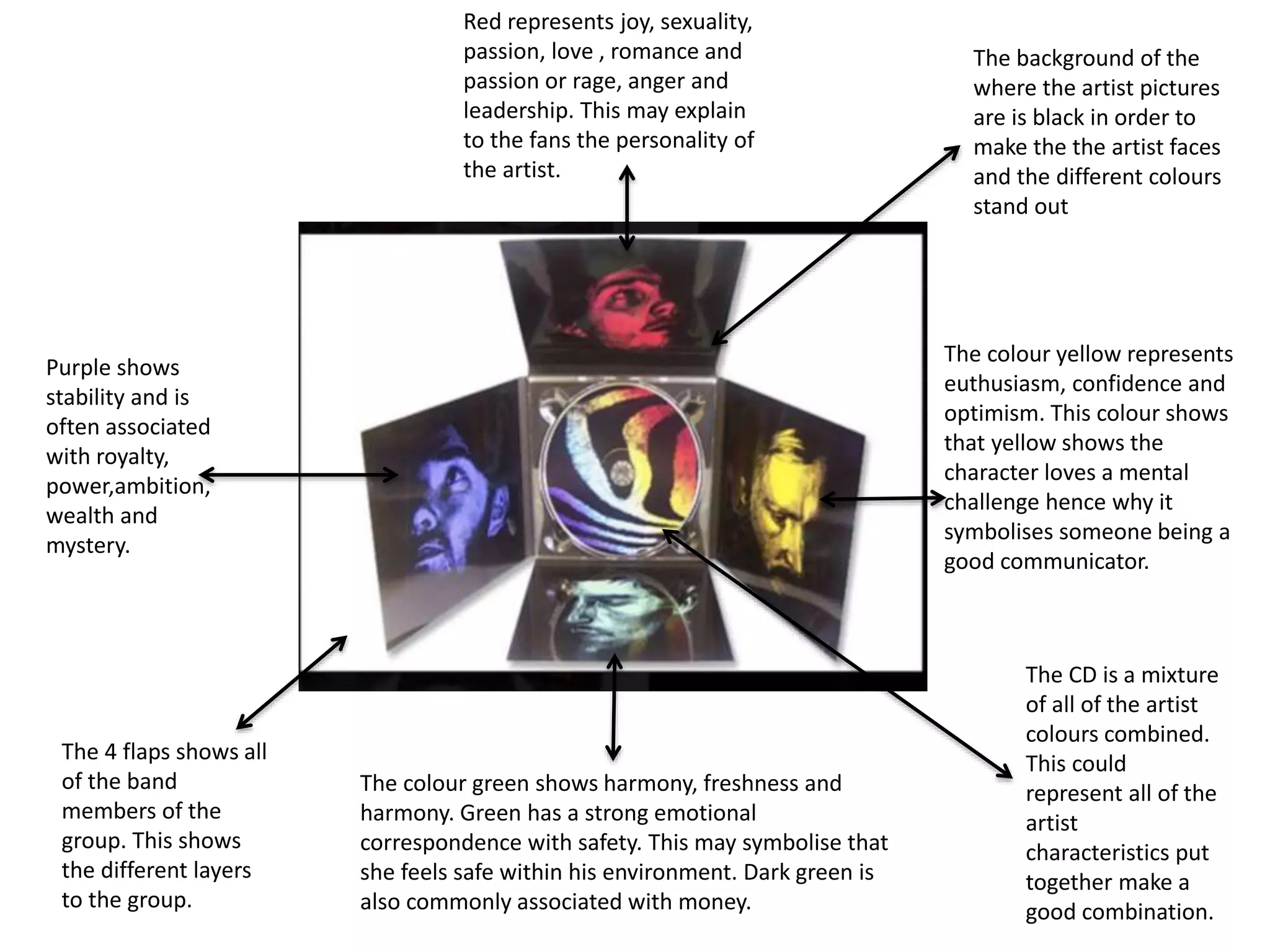 The document discusses the symbolic meanings of different colors that are used in an artist's album packaging. Yellow represents enthusiasm and mental challenge, showing the artist is a good communicator. Green symbolizes harmony, safety, and money. Purple shows stability, royalty, power, ambition, and mystery. Red can mean passion and love or anger and leadership. The background is black to make the colors stand out, and the CD is a mixture of all the artist's colors to represent their combined characteristics.