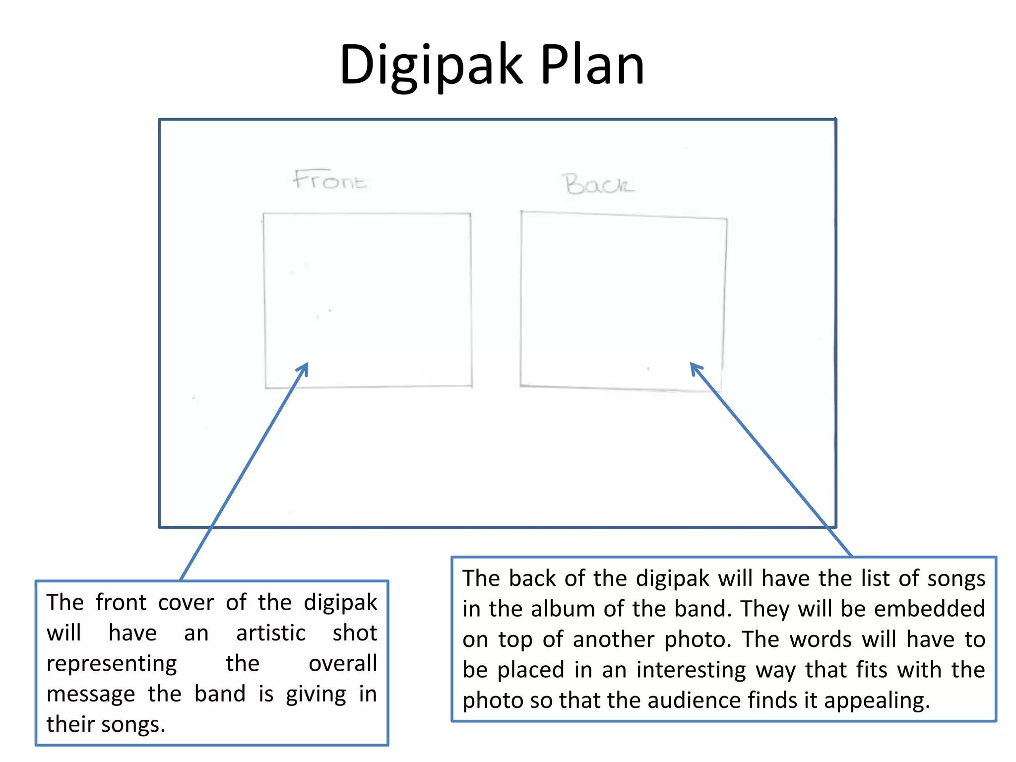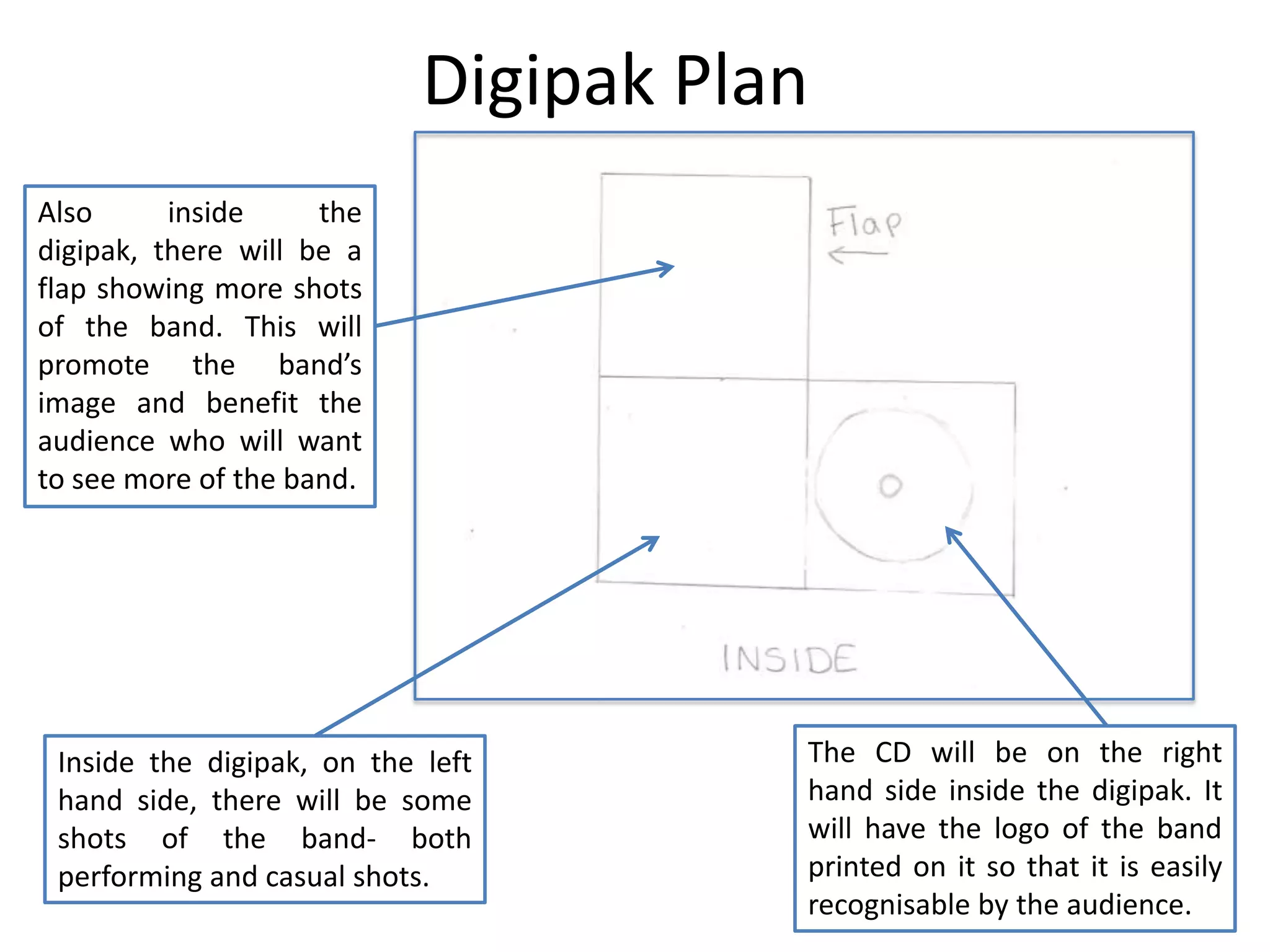 The digipak plan outlines the design for a band's album packaging. The front cover will feature an artistic shot representing the band's message, while the back will list the songs embedded on a photo. Inside flaps and panels will showcase more photos of the band to promote their image and performances, with the CD printed with the band's logo on the right hand side.