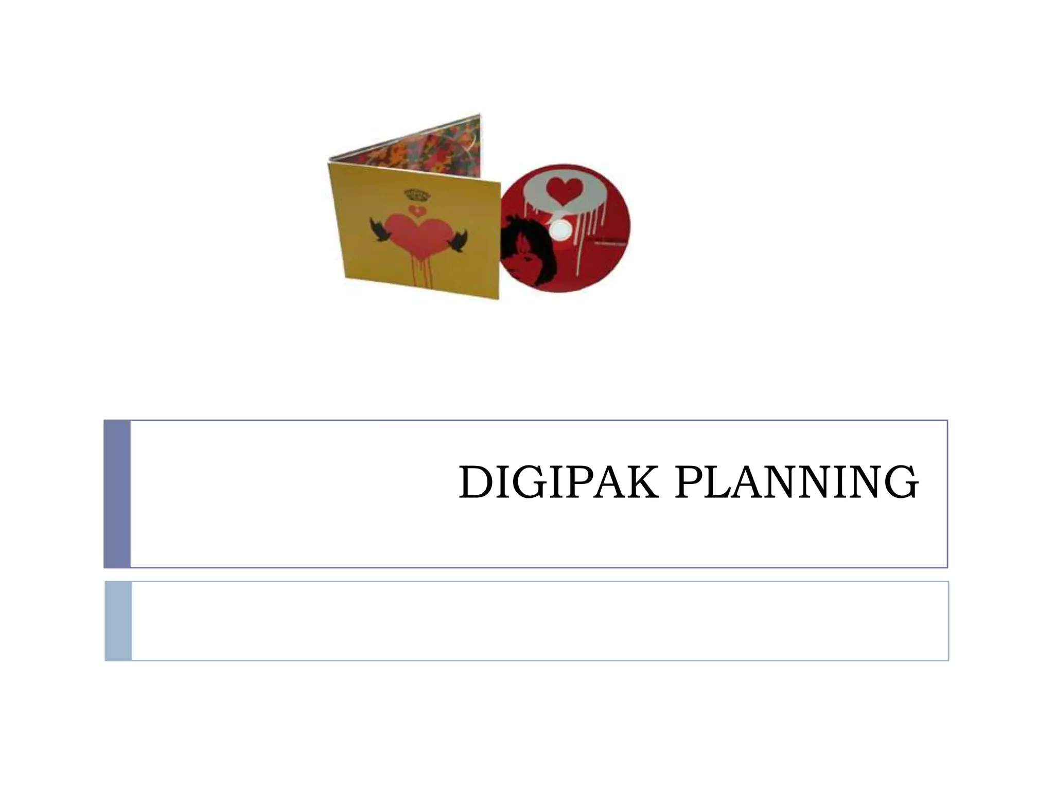 The document outlines plans for a 6-panel digipak. The first panel will feature a photo of the band with the album name. The second, third and fourth panels will each feature a biography of one band member. The fifth panel will contain the CD. The final panel will include lyrics from the album's single. Examples of digipak templates are provided, including a 6-panel template that could be adapted for the project.