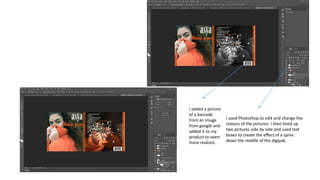 The document describes the process of creating a digipak, where the author used Photoshop to edit pictures and arrange two images side by side with text boxes down the middle to create a spine effect. They also added a barcode image from Google to make the product seem more realistic. Before adding images, the author constructed the text first to determine what kind of images to use.