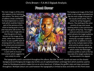 This document analyzes the digipak designs of albums by Chris Brown, J.Cole, and Jay-Z. It discusses design elements like the artist images, backgrounds, typography, and color schemes. Key points made include that Chris Brown's design focuses on his visual image and persona, J.Cole's references his past album themes of basketball, and Jay-Z's simple black design emphasizes his authority and status in hip hop. Consistent design elements like fonts and colors are used across the digipaks to create cohesion.