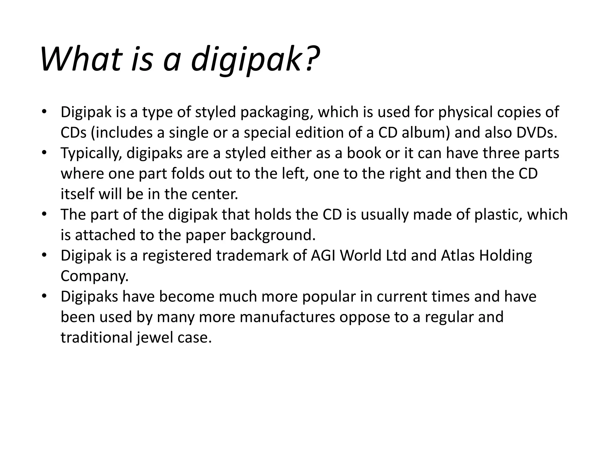 This document provides information about CD digipaks and examples of their design. A digipak is a type of packaging for CDs and DVDs that is made of cardboard with plastic in the center to hold the disc. Examples are given of two album digipaks and how they carry a consistent theme throughout with images, colors, and placement of content like lyrics and discs. Features that should be included in a digipak design are discussed, such as protective slots for content and crediting record labels.