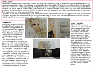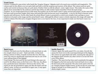 The document summarizes the design elements used on the album packaging, or digipak, of three different albums: