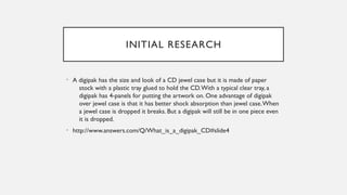 Digipaks are paper CD cases with a plastic tray glued inside to hold the CD. They have several panels for artwork and fold like a book into a square shape. Some advantages are better shock absorption than jewel cases and the artwork can be displayed on multiple panels. Digipaks commonly contain images of the artist or album, tracklists, and sometimes extra artwork or lyrics. They are often used for deluxe or special editions of albums.
