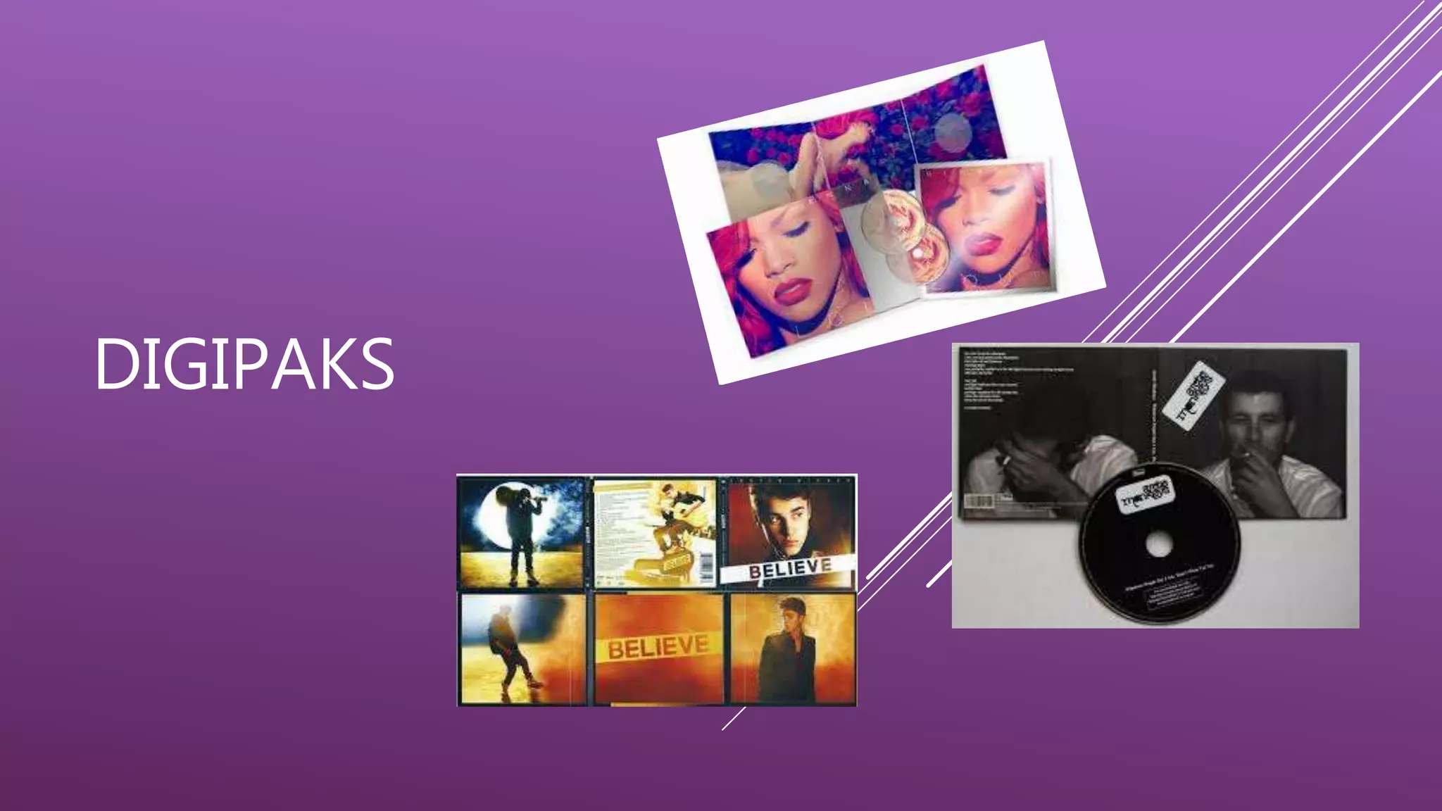 Digipaks are soft packaging often used for CD singles and special editions. They consist of a gatefold paper or cardboard cover that holds one or more plastic trays for CDs/DVDs. Digipaks promote artists by displaying their image and branding, linking to their music and emphasizing their brand. They benefit artists by increasing awareness, popularity, and sales.
