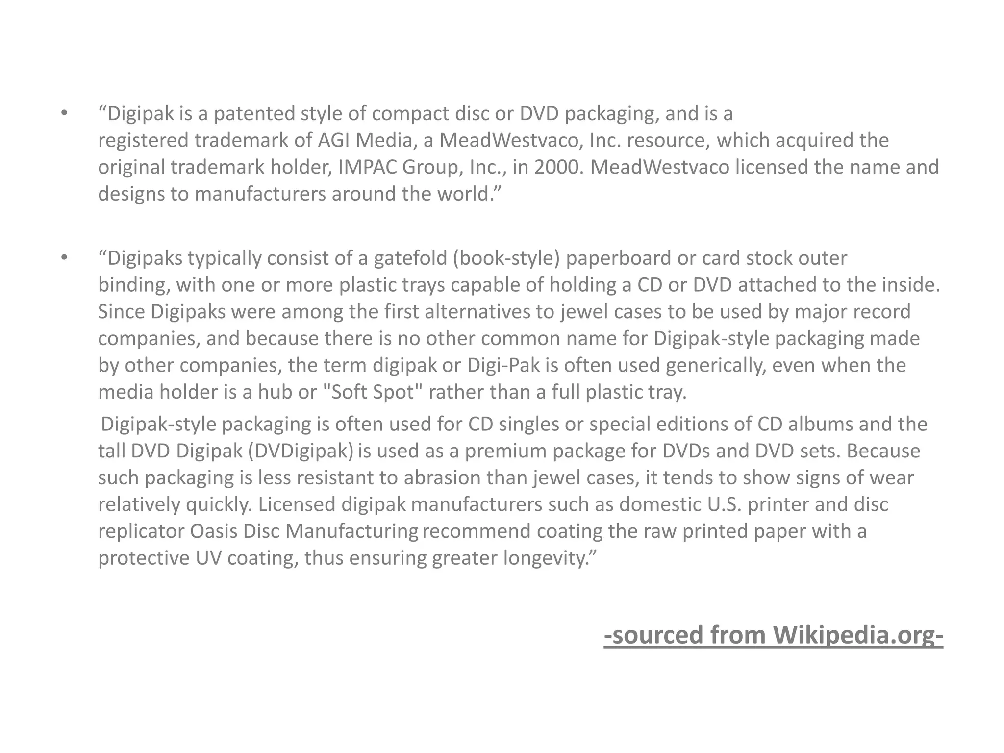 The document provides information about different types of CD/DVD packaging including digipaks. It notes that digipaks typically have a paperboard outer binding and one or more plastic trays inside to hold a CD or DVD. The term "digipak" is often used generically for similar packaging from other companies. Digipak-style packaging is commonly used for CD singles or special editions and tends to show signs of wear more quickly than jewel cases unless coated with a protective UV coating. The document also analyzes and compares different album/single cover designs and advertisements in terms of themes, imagery, target audiences, and how they relate to the genre of music.