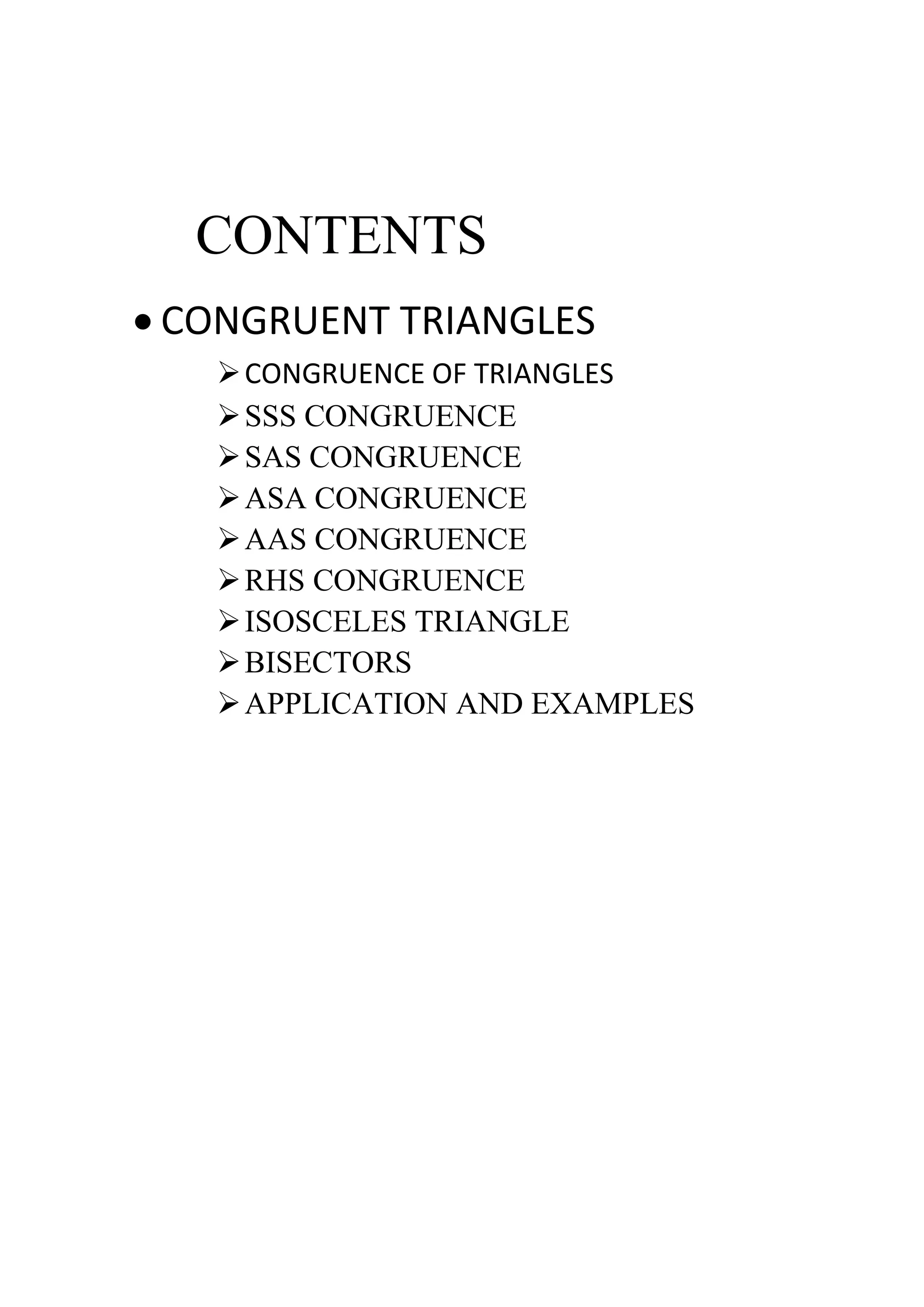 This document provides information about congruent triangles. It defines congruent triangles as two triangles that have the same shape and size, with corresponding sides and angles being equal. It describes several triangle congruence theorems including SSS, SAS, ASA, AAS, and RHS, which establish that triangles are congruent if certain combinations of sides and/or angles are equal. It also discusses isosceles triangles, angle bisectors, and provides examples applying the congruence theorems to prove triangles are congruent or not.
