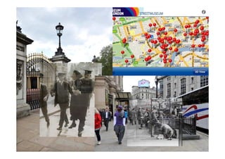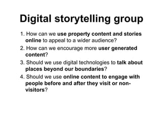 The document discusses digital storytelling and using online content to engage wider audiences. It considers how to encourage more user-generated content and whether to use digital technologies to discuss places beyond boundaries. Recommendations include having an integrated digital strategy, basic in-house skills, agile development, service design, and an entrepreneurial approach. Examples provided include using websites, Flickr pools, YouTube channels, multimedia guides and digital installations for visits and non-visits through collections databases and cross-property storytelling.
