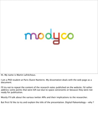 The document summarizes Martin Lafréchoux's presentation on tracking the spread of a misattributed Martin Luther King Jr. quote on Twitter in May 2011. Lafréchoux used various tools to reconstruct the information cascade, or "digital paleontology", starting from a Facebook post that misattributed the quote to King. He traces how the quote spread on Twitter, with some high-profile shares, before journalists eventually debunked the fake quote. Lafréchoux evaluated the different Twitter APIs and tools he used to analyze the cascade long after it happened in real-time.