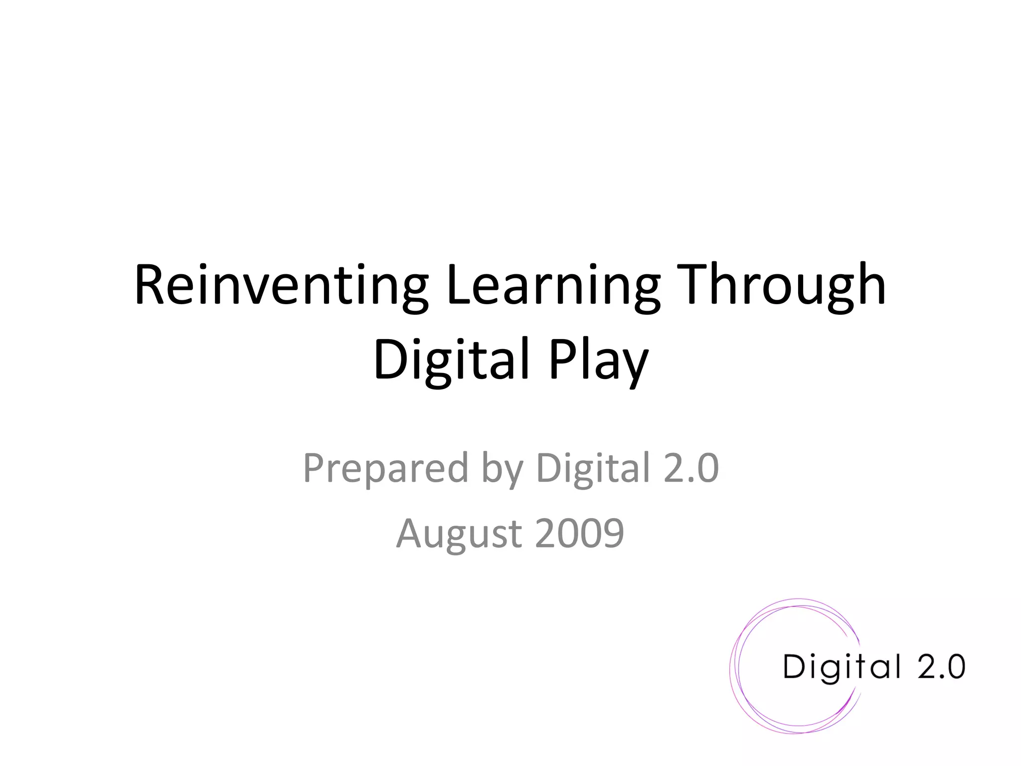 This document discusses how Digital 2.0 uses digital games and play to provide learning solutions for training, education, and communication. They believe games provide an engaging experience that enhances learning. Their end-to-end service includes research, design, testing, and project management to create successful games tailored to customers' needs. Studies show games can improve focus, productivity, and reduce stress. Digital 2.0 offers demo workshops to show how games can benefit organizations.