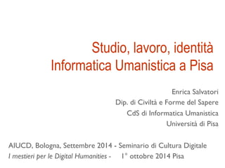 Il documento esamina l'evoluzione dell'informatica umanistica all'Università di Pisa e le competenze richieste nel mondo del lavoro. Viene analizzata la condizione occupazionale dei laureati e le loro percezioni riguardo alla preparazione ricevuta, evidenziando sia le forze che le debolezze del corso. Infine, si discute la necessità di una visione sistemica interdisciplinaire nelle humanities in risposta alle sfide contemporanee.