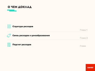 Документ анализирует структуру расходов digital-агентств и их связь с ценообразованием, включая различные коэффициенты и расчёты, касающиеся сотрудников, фриланса и субконтрактов. Рассмотрены основные статьи расходов, такие как зарплаты, налоги, накладные расходы, а также предложены формулы для вычисления полных затрат. В заключении обсуждаются проблемы учета времени и важность точной оценки проектов.