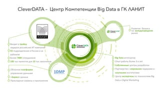 Документ представляет стратегию и подходы компании ГК Ланит к использованию данных и технологий big data в сфере маркетинга. Подчеркивается важность сбора и анализа клиентских данных, а также применения искусственного интеллекта для повышения эффективности маркетинга и продаж. Ланит стремится объединить информацию и знания для улучшения клиентского опыта и достижения поставленных бизнес-целей.