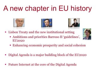This document discusses the European Union's Digital Agenda, which aims to promote an open and competitive digital economy in Europe. It outlines several major initiatives of the Digital Agenda, including enhancing broadband access, developing a digital single market, boosting innovation through research funding, and ensuring digital inclusion. The document also discusses using information and communication technologies to address issues like an aging population in Europe and improving public services.