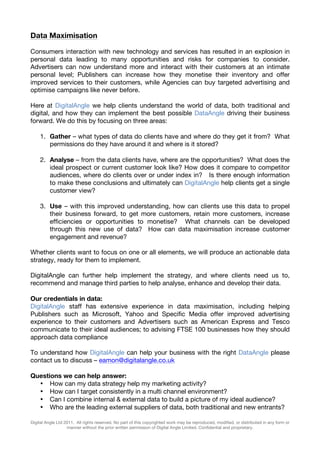 DigitalAngle is a digital consultancy that helps clients develop the right digital strategies for their businesses. They specialize in data maximization and digital marketing. For data, they help clients gather, analyze, and use data to better understand customers and drive business results. For marketing, they help clients structure digital teams, plan and measure online campaigns, and optimize spending across channels like search, social media, and display advertising. Their goal is to provide clients with the best "digital angle" to approach opportunities and meet business challenges.