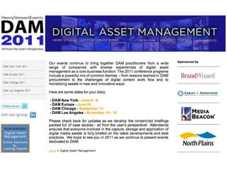 This document discusses digital asset management and provides recommendations for organizations managing their digital files and assets. It addresses questions around what types of assets to manage, whether to use local or cloud-based storage, options for DAM software and hosting, and resources for learning best practices. The key recommendations are to start small with one type of asset and workgroup, establish naming conventions, and get support from management to implement a sustainable DAM solution.