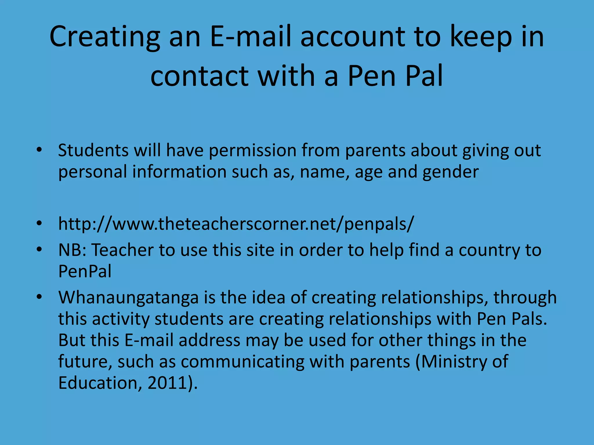 This document provides guidance for students to create email accounts to communicate with pen pals. It outlines the steps for setting up a Gmail account, including getting parental permission to share limited personal information. Students are instructed to only include their name, age, gender, and discuss as a class what private information should not be shared online for digital security. Creating email accounts allows students to connect with others, join online communities, and facilitates relationship building with pen pals while following guidelines for appropriate online sharing.