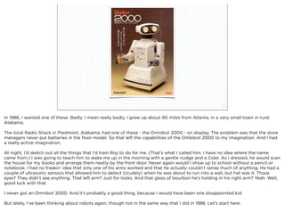 The document discusses the evolution of robots and technology, contrasting the limited capabilities of old devices like the Omnibot 2000 with modern smartphones. It emphasizes the importance of context awareness in mobile experiences and how touch interaction has transformed user engagement. Furthermore, it highlights various mobile applications that effectively utilize sensors and touch gestures to enhance user experience.