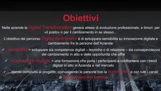 Il percorso di digital awareness si propone di sviluppare competenze digitali e consapevolezza del cambiamento nelle aziende, affrontando le attese e i timori legati alla digital transformation. Attraverso assessment, workshop interattivi e la creazione di una community online, il progetto mira a formare i partecipanti sui megatrend di innovazione, facilitando l'interazione tra conoscenze tecniche e relazionali. Le sessioni formative si concentrano su competenze di base e specifiche per ruolo, incentivando un'evoluzione comunicativa all'interno dell'azienda.