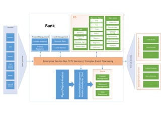 This document provides an overview of the various channels, systems, and services that are either sources of data or destinations for processed data for a bank. It includes both internal channels and systems like ATMs, branches, and core banking systems as well as external sources of data, services, and destinations of processed data like credit bureaus, CRM systems, payments systems, and regulatory reporting. The document also lists the integration and data processing services like the enterprise service bus, data warehousing, and complex event processing that are used to ingest, transform, and move data between these various sources and destinations.
