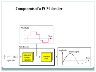 The document discusses digital baseband modulation techniques in communication systems, explaining the process of converting analog information into digital form through sampling, quantization, and encoding. It details various components such as source encoders, channel encoders, and modulators, along with methods for ensuring reliable transmission and decoding of signals. Additionally, it covers signal representation, time and frequency domain concepts, and line coding for efficient data transmission.