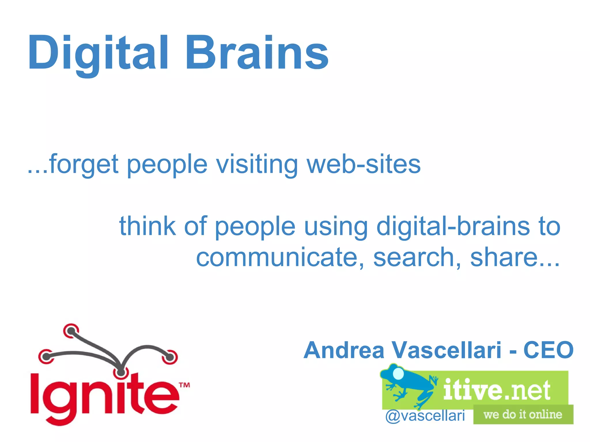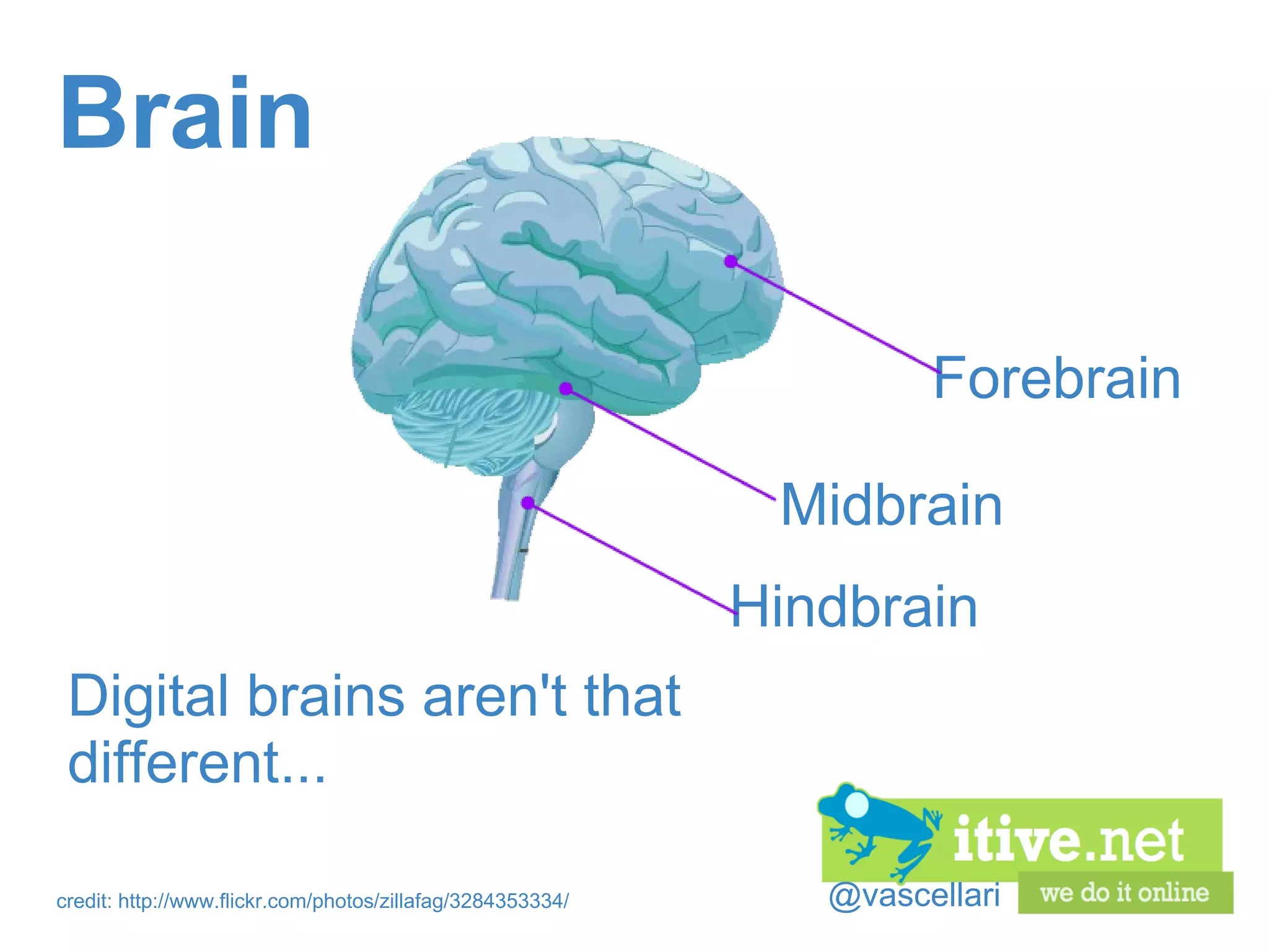 The document discusses digital brains and how they are analogous to human brains. It compares the hindbrain, midbrain and forebrain of human brains with different functions of digital brains like indexes, forms, widgets, analytics, sharing features, and overall design and functionality. It suggests that digital brains can help people communicate, search, and share information more efficiently. It also discusses concepts like digital evolution, natural digital selection, and how features can help digital entities survive and thrive on the internet.