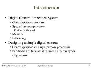 The document describes the design of a simple digital camera. It discusses the key requirements of capturing images, storing them digitally, and downloading images to a computer. It outlines the main components that would be needed, including a charge-coupled device (CCD) sensor to capture light as digital values, memory to store images, and an interface to transfer images to a computer. The document also discusses some of the main design challenges, such as optimizing various metrics like cost, power usage, performance and time to market.