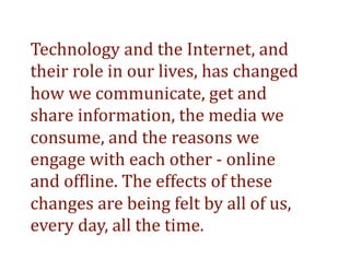 The document discusses the transformative impact of technology and the internet on communication and community engagement in the digital age. It emphasizes the importance of meaningful interactions, understanding audience needs, and creating relevant content while fostering offline relationships. Additionally, it offers strategies for effective social media usage and building a network of supporters who can amplify organizational messages.