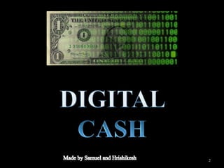 The document discusses the evolution and functionalities of digital cash, highlighting its similarities to traditional cash, enabling features like anonymity and offline transactions. It elaborates on the roles of cryptography, digital signatures, and the potential of e-currencies such as Bitcoin. Additionally, it outlines the pros and cons of digital cash systems, including transaction efficiencies and scalability issues.