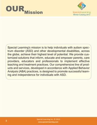 Special Learning provides customized solutions to help individuals with autism spectrum disorder and other developmental disabilities achieve their highest potential. This catalog outlines their mission and products, which are developed in accordance with Applied Behavior Analysis practices to promote successful learning and independence. The catalog is organized to Inform, Educate, and Empower through eBooks, literature summaries, webinar trainings, teaching tools, visual supports, and mobile apps.
