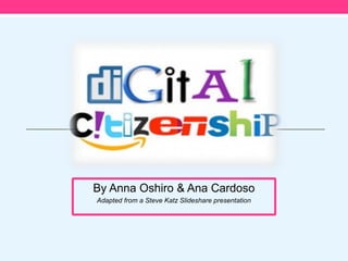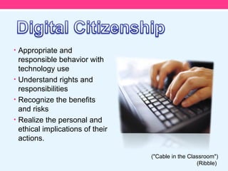 This document discusses digital citizenship and proper online etiquette. It identifies nine elements of digital citizenship including appropriate behavior, understanding rights and responsibilities, recognizing risks and benefits, and realizing personal implications of online actions. The document also provides definitions of netiquette and cyberbullying, and suggests questions for evaluating online content before posting. Guidelines are offered for helping prevent cyberbullying.
