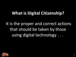 The document discusses the nine elements of digital citizenship according to Ribble and Bailey, focusing on five elements: digital rights and responsibilities, digital literacy, digital etiquette, digital security, and digital communication. It provides scenarios for each element and discusses appropriate responses and ways to apply the concepts in an educational setting. Teachers should model good digital citizenship and educate students on topics like validating online sources, appropriate email communication, and online safety.