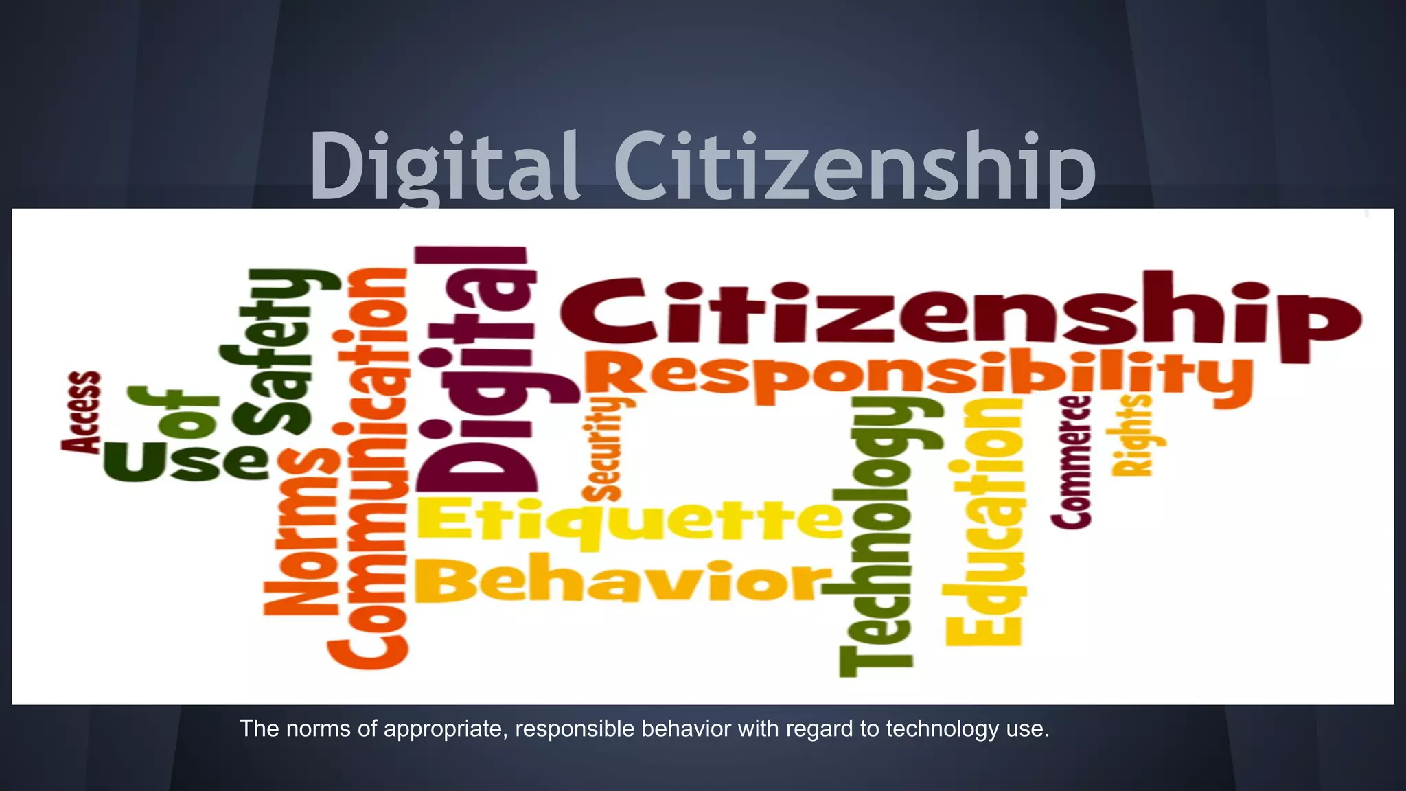 The document defines several aspects of digital citizenship including digital access, commerce, communication, literacy, etiquette, law, rights and responsibilities, health and wellness, security, and provides statistics related to technology use. Key topics covered are appropriate online behavior, using technology responsibly, understanding digital laws, protecting privacy and security, and potential issues with overuse of digital devices.