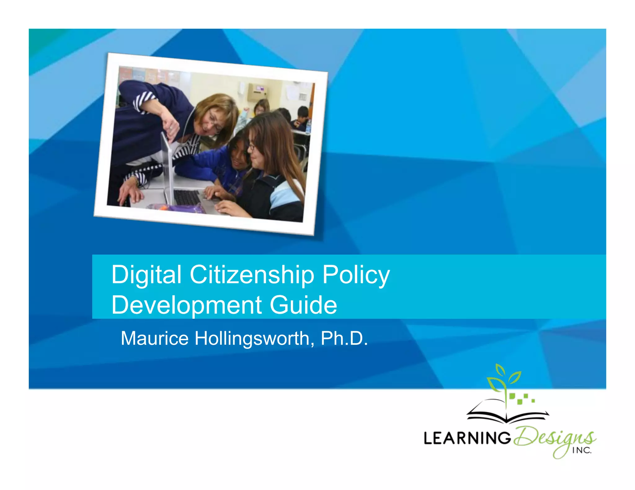 This document provides an overview and guidance for developing digital citizenship policies in K-12 schools. It defines digital citizenship and outlines Ribble's nine elements of digital citizenship. The document discusses the importance of digital citizenship policies in supporting powerful pedagogy, student safety and readiness, meeting requirements of education acts, and addressing Ohler's argument that schools should take a "one life" rather than "two lives" approach to students' digital experiences. It provides examples of acceptable use policies versus digital citizenship policies and recommends a process for policy development that involves compliance as well as commitment and teamwork.