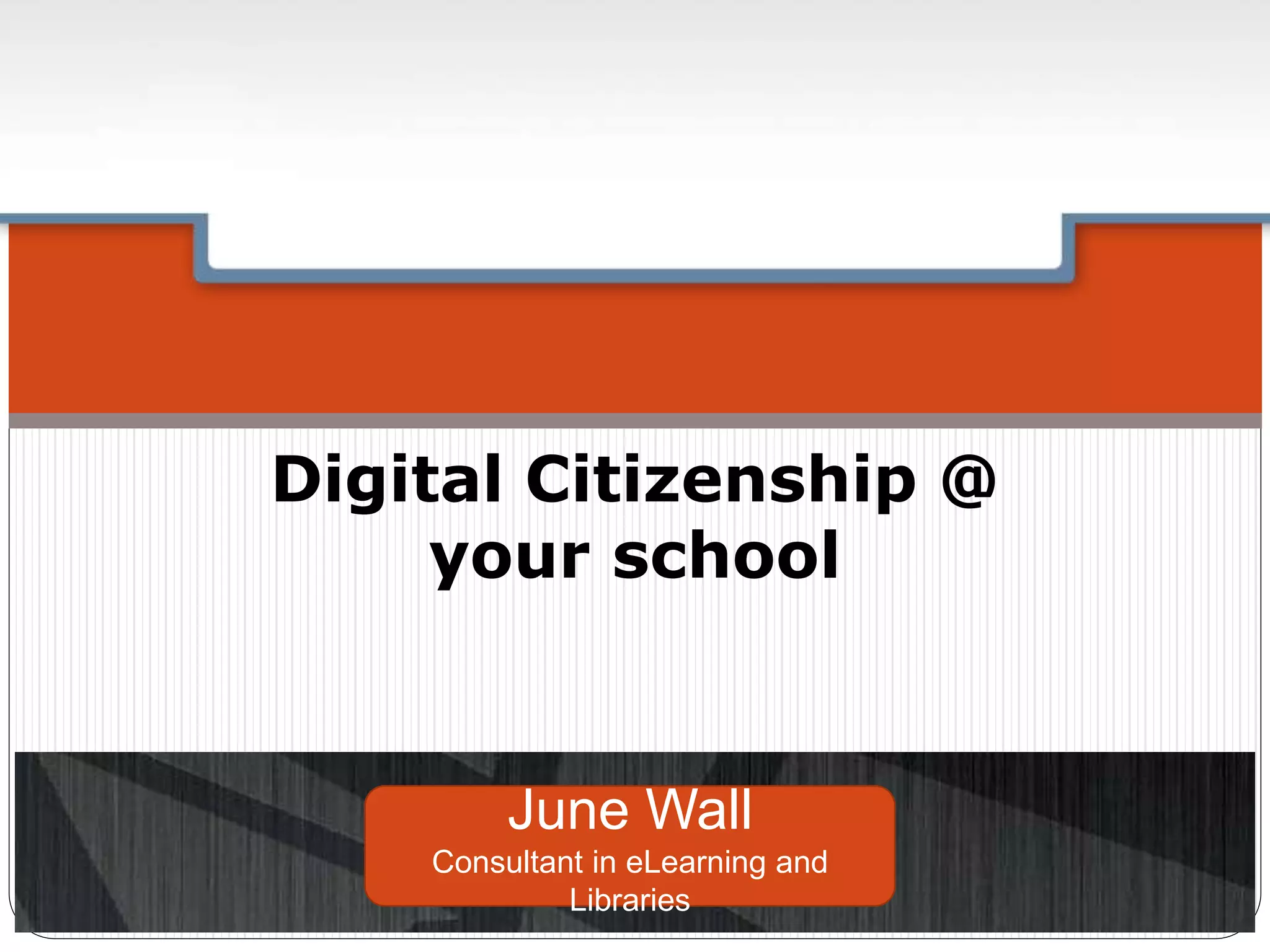 The document outlines the concept of digital citizenship in education, emphasizing the responsible and ethical use of technology among students, staff, and parents. It discusses necessary components for creating a digital citizenship program, including tools and strategies, as well as the evolving online landscape and its impact on youths. The document also highlights the importance of collaboration among government, parents, and schools to ensure a safe and informed digital environment.