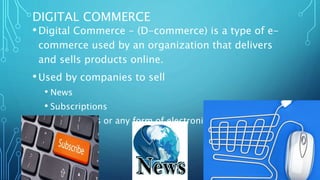 Digital commerce, or D-commerce, involves the online delivery and sale of electronic products like news, subscriptions, documents, and other digital content. Companies that engage in digital commerce are responsible for payment processing, billing, and refunds. It uses a pay-as-you-go model where customers can purchase content immediately after entering a website with payment information stored. Digital commerce mainly benefits publishers of books, news, magazines and papers by providing an additional avenue for reselling works and generating profit. While convenient for consumers, digital commerce can pose risks like credit card theft that users should be aware of when making online purchases.