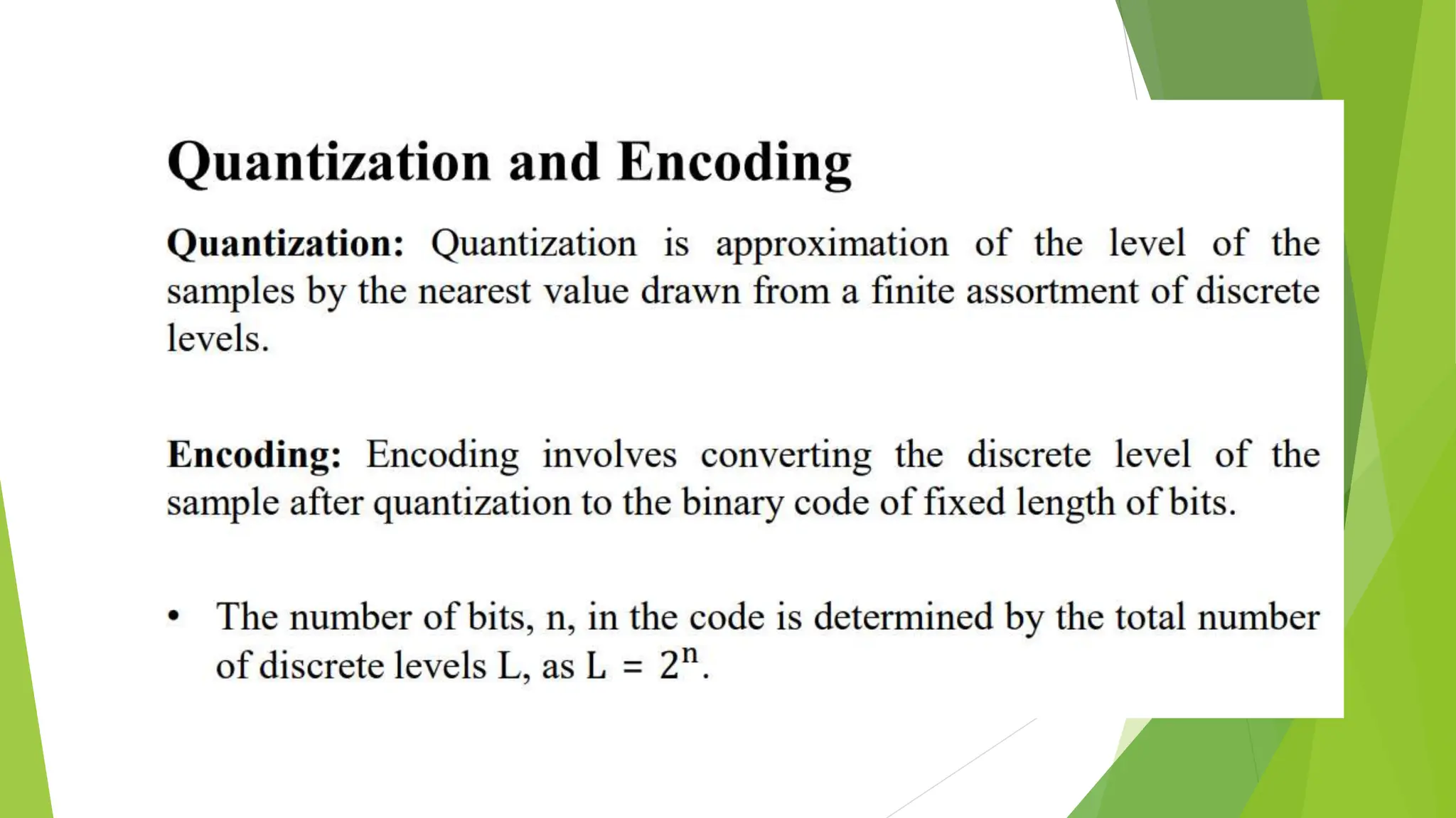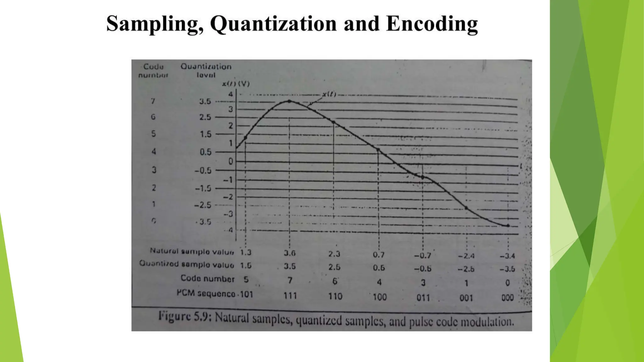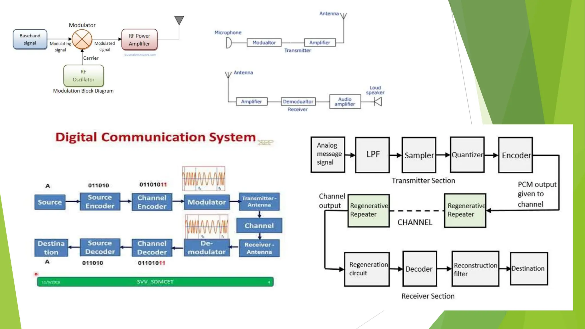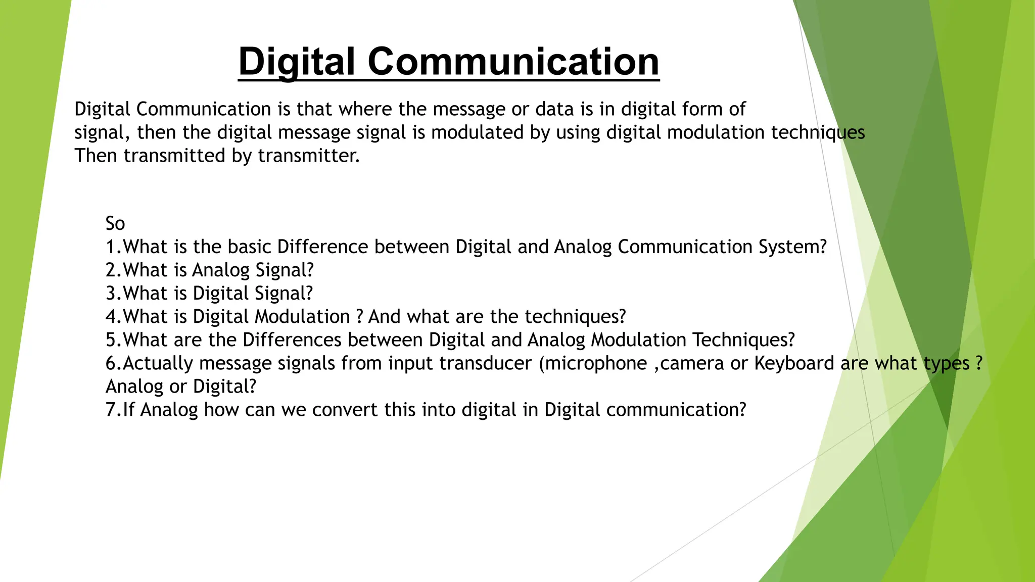 The document provides an overview of digital communication, comparing it with analog communication, and explaining the concepts of digital and analog signals, digital modulation techniques, and A/D conversion. It also discusses quantization, sampling, and the processes involved in converting and recovering signals, including examples and calculations pertaining to bit rates, sampling rates, and quantization errors. Finally, it addresses problems related to signal bandwidth and signal-to-noise ratio (SNR) for various scenarios.