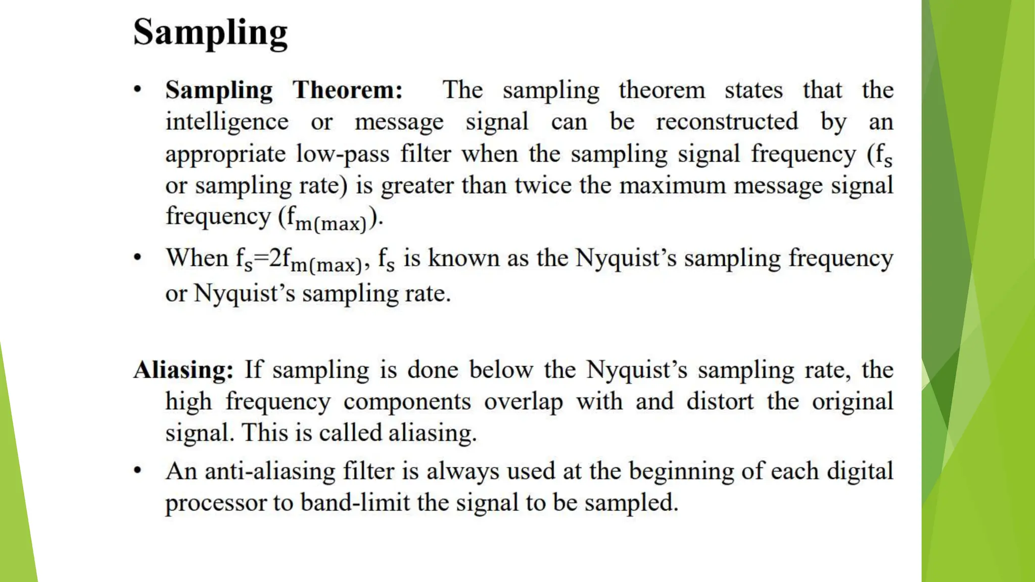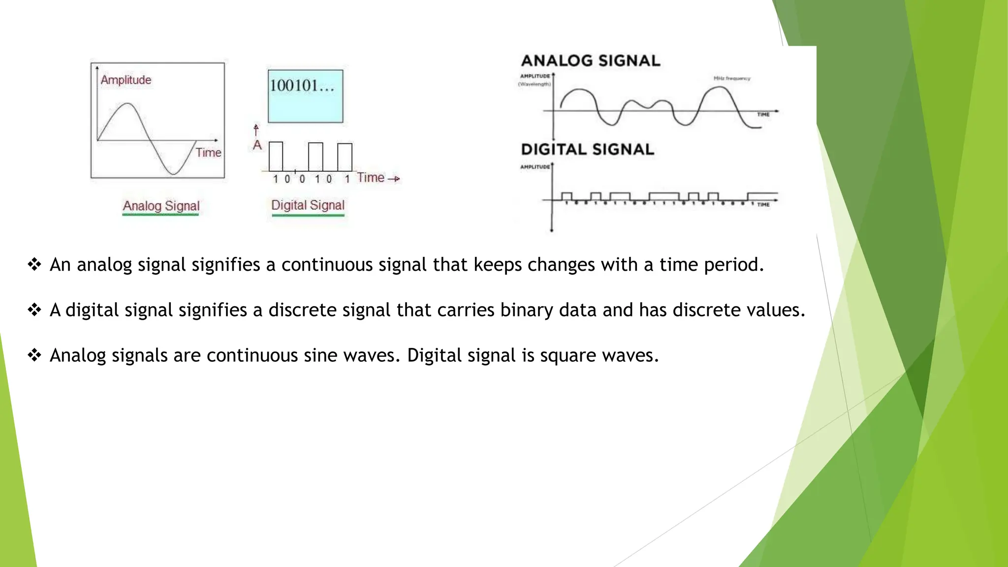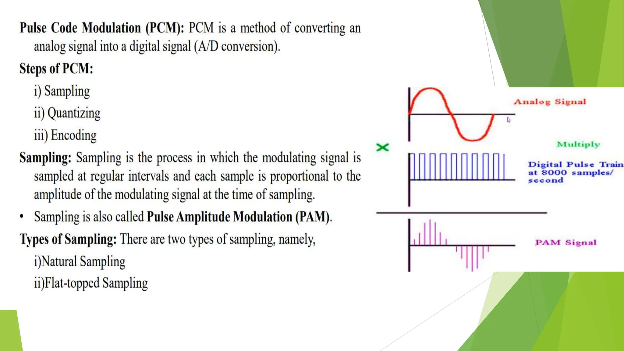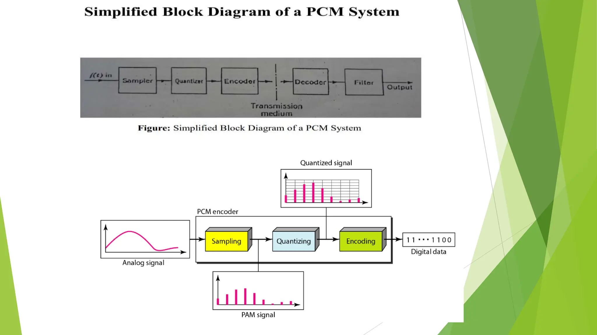 The document provides an overview of digital communication, comparing it with analog communication, and explaining the concepts of digital and analog signals, digital modulation techniques, and A/D conversion. It also discusses quantization, sampling, and the processes involved in converting and recovering signals, including examples and calculations pertaining to bit rates, sampling rates, and quantization errors. Finally, it addresses problems related to signal bandwidth and signal-to-noise ratio (SNR) for various scenarios.