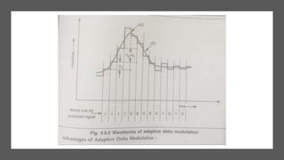 The document discusses digital communication techniques, focusing on Differential Pulse Code Modulation (DPCM) and Delta Modulation (DM). DPCM improves encoding by summarizing predicted sampled values to eliminate redundancy, while DM features a higher sampling rate with smaller quantization steps. Additionally, Adaptive Delta Modulation adjusts step sizes for better fidelity in varying signal slopes.