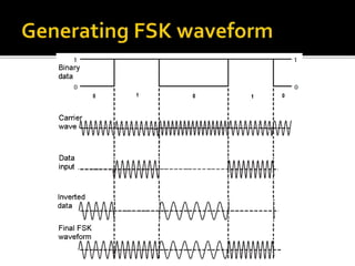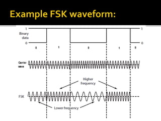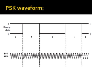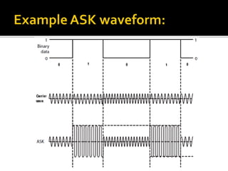 ASK, FSK, PSK, and QAM are common digital modulation techniques. ASK represents binary digits by transmitting different amplitude carrier waves. FSK uses different frequencies, while PSK and QAM vary the phase and amplitude of the carrier signal. PSK can be binary BPSK or quadrature QPSK using four phases. QAM combines amplitude and phase modulation for increased data capacity.