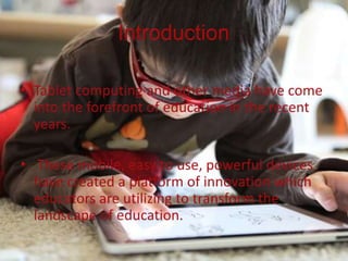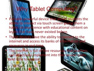 This document discusses how teachers can use technology to interact with students to improve participation and success. It outlines 4 goals: 1) conducting a technology use survey, 2) presenting guidelines for proper tech implementation, 3) interacting with peers using discussion tools, and 4) assessing learning with a short quiz. The presentation provides an overview of how interactive technology aligns with social cognitive learning theory and encourages attention, retention, and motivation. It highlights the functionality and financial benefits of tablet computers and interactive whiteboards for engaging lessons.