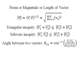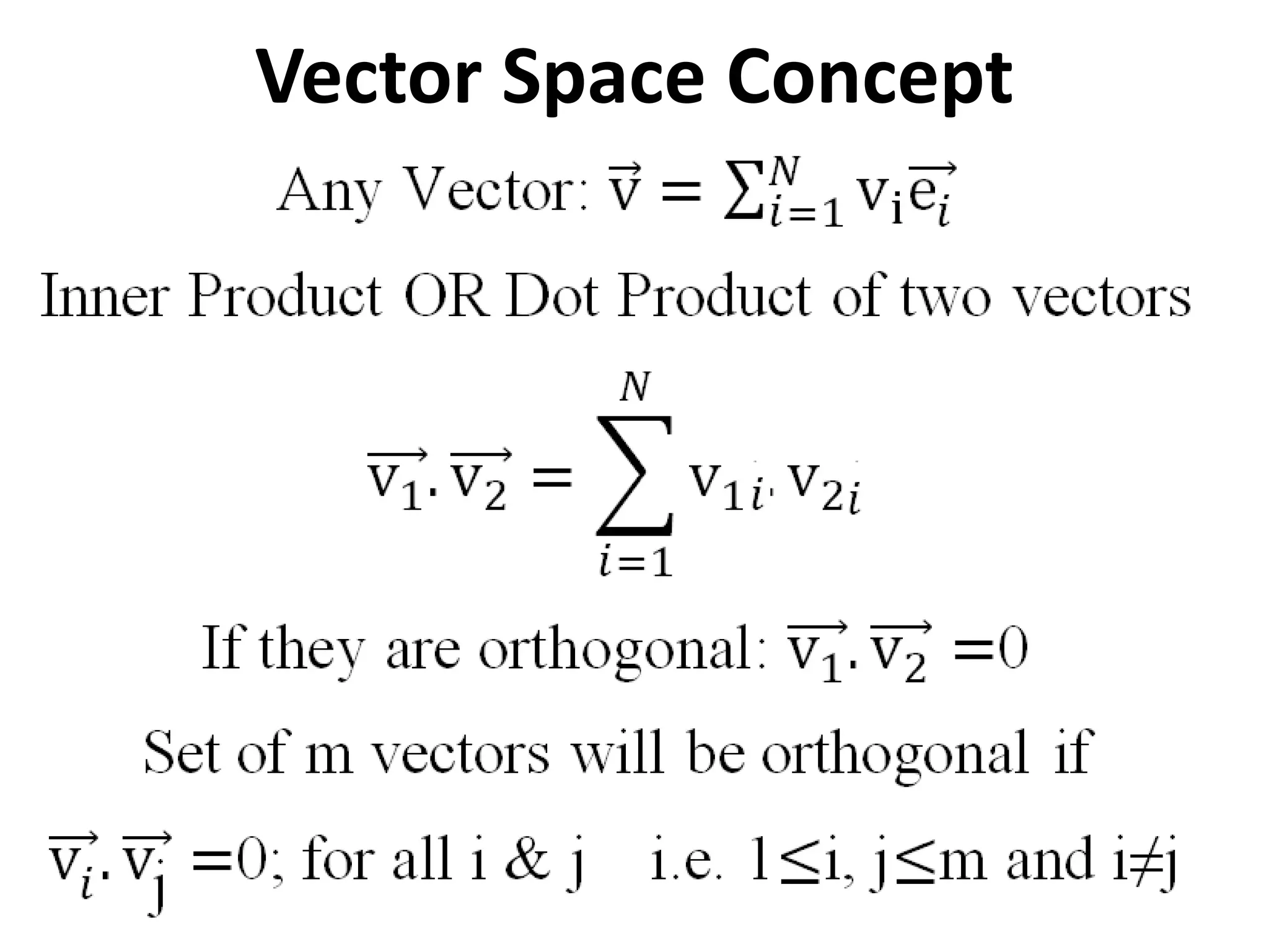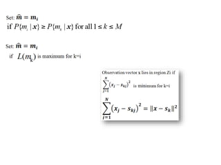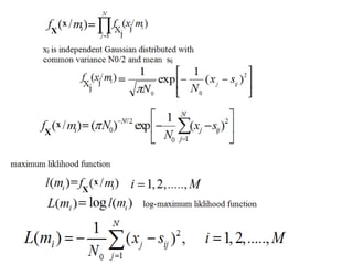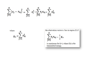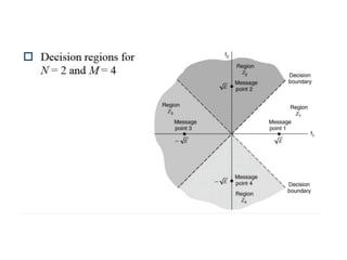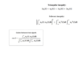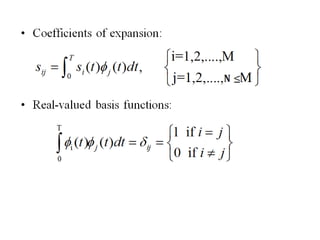 Vector space concepts can be used to represent energy signals. Any set of signals can be represented as linear combinations of orthogonal basis functions in an N-dimensional vector space. Each signal is determined by its vector of coefficients. This geometric representation in vector spaces allows defining properties like vector lengths, angles between vectors, and inner products. It provides a mathematical basis for analyzing signals and noise in communication systems.