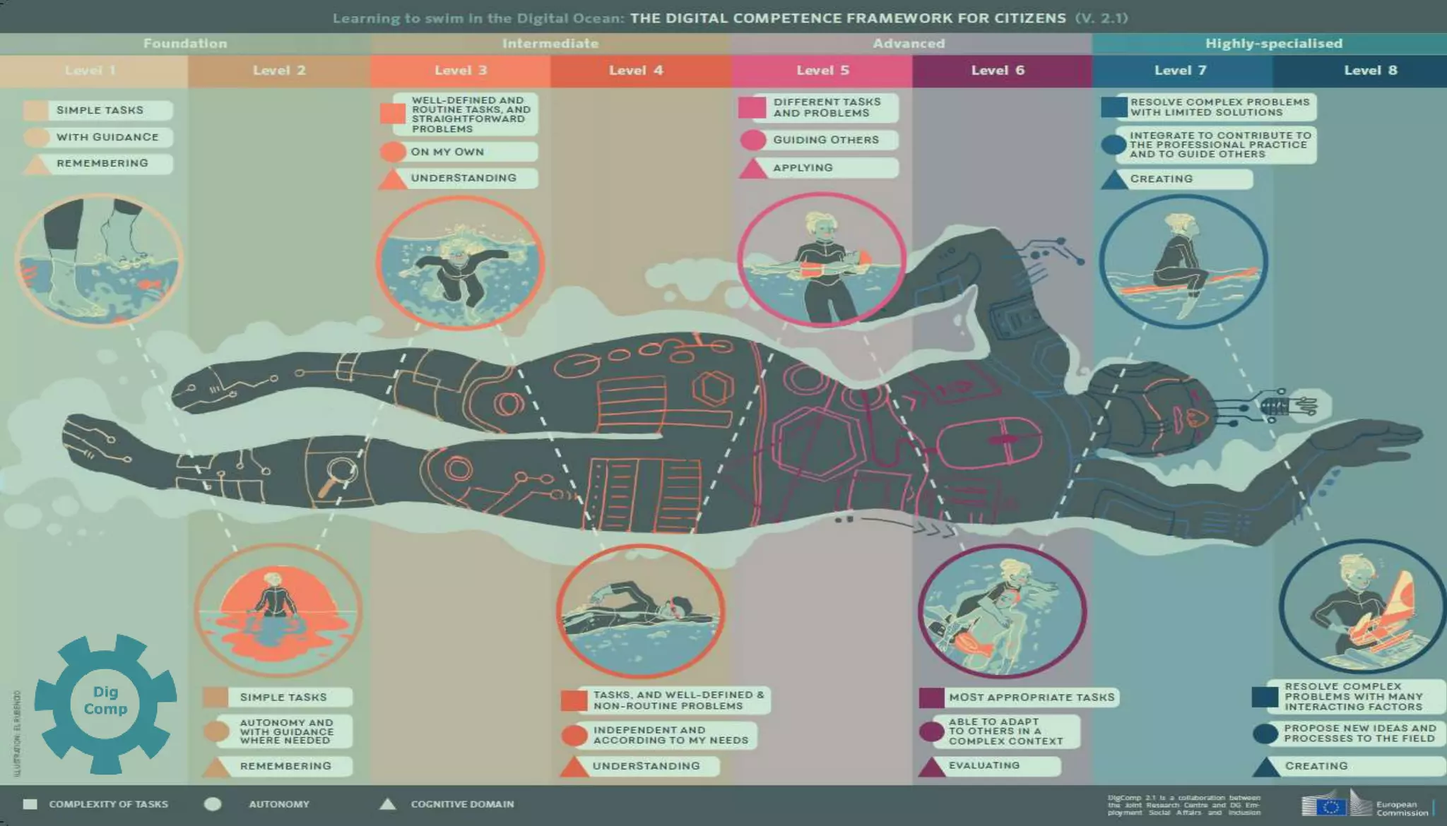 The document discusses capacity building for online and blended learning in Europe. It introduces the European Digital Competence frameworks for learners (DigComp) and educators (DigCompEdu). DigComp defines five areas of digital competence and specific competences within each area. DigCompEdu describes what it means for educators to be digitally competent across six competence areas and six proficiency levels. The frameworks provide a shared understanding of digital competence and are used in various ways, such as curriculum development and teacher training.