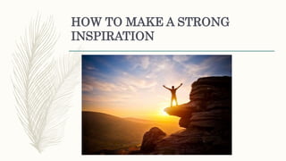 The document discusses inspiration and how to make it strong and meaningful. It defines inspiration as a process of being mentally stimulated to create something, rather than a random feeling. While inspiration is accessible through social media, it often leaves people wanting more without achieving anything. True inspiration requires discipline rather than just positive feelings. It should facilitate progress towards goals and increase well-being. To make inspiration strong, it's important that it holds up amid realities and demands action rather than just being fleeting emotions.
